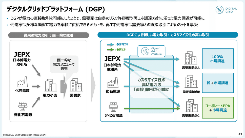 デジタルグリッドは、電力の直接取引を可能にする「デジタルグリッドプラットフォーム(DGP)」を提供する企業です。DGPによって、需要家は自社の再エネ比率や調達方針に合わせて電力を柔軟に調達でき、発電家も多様な顧客に電力を届けることができます。