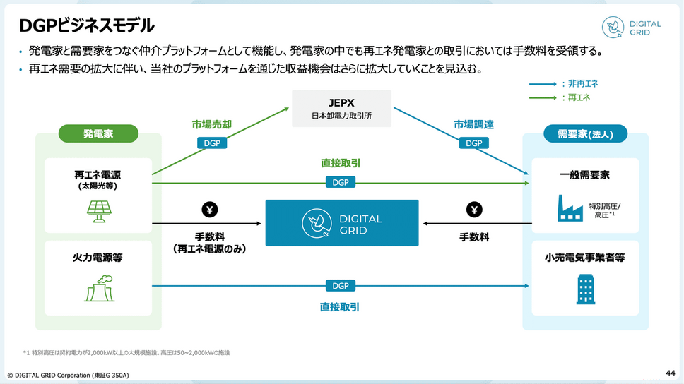 同社は発電家と需要家を仲介するプラットフォームとして機能し、特に再エネ電源との直接取引において手数料収入を得ています。再エネ需要が拡大する中、プラットフォームを通じた収益機会は今後さらに増える見込みです。
