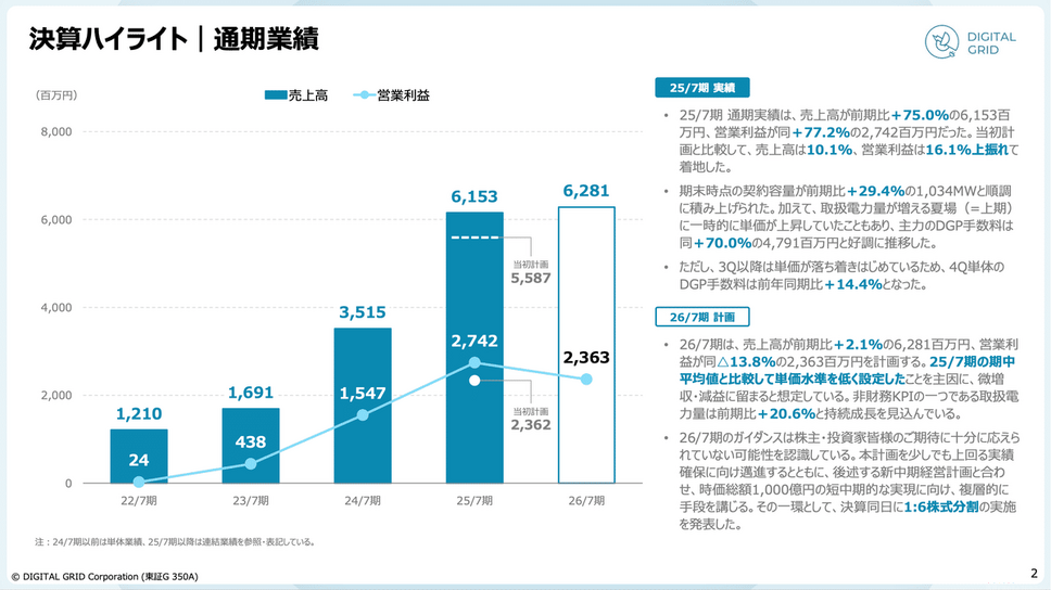 デジタルグリッドの2025年7月期の通期業績は、売上高がYoY+75.0%の61.5億円、営業利益もYoY+77.2%の27.4億円と大幅増収増益となりました。