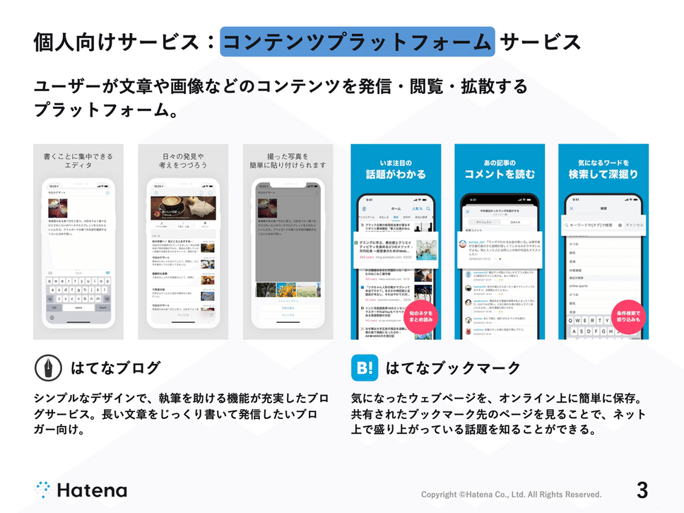 同社は、個人向けサービスとして、長文執筆に向いた「はてなブログ」と、気になるWebページを保存・共有できる「はてなブックマーク」を展開しています。