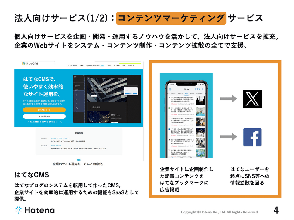 また、コンテンツプラットフォームで培ったノウハウを、コンテンツマーケティング事業として、企業向けに展開しています。同社が運営する「はてなCMS」では、効率的なサイト運用が可能です。