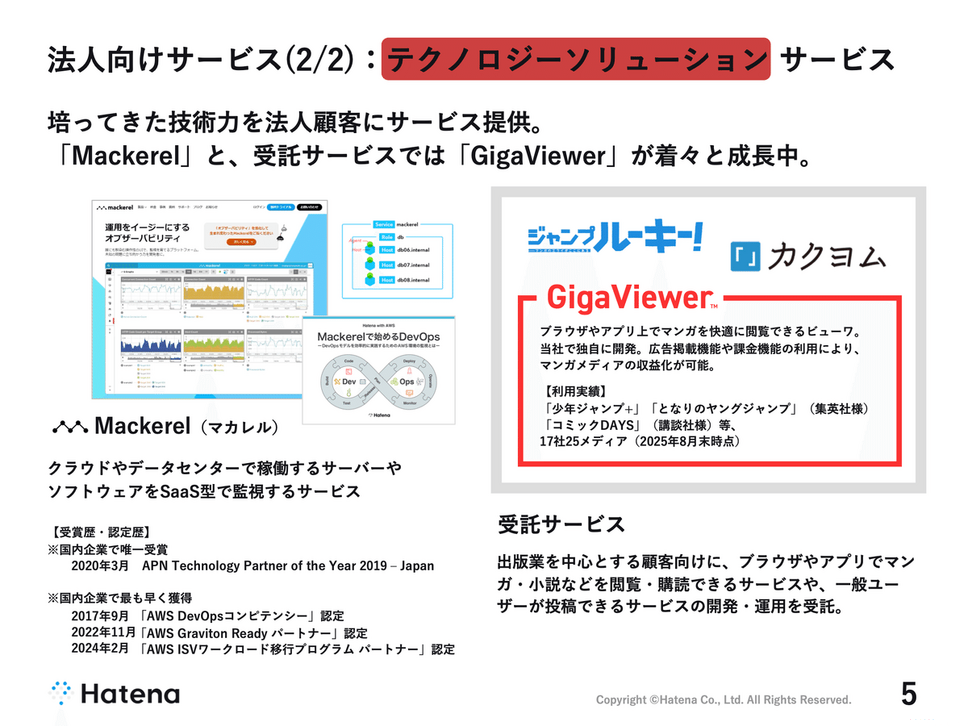 具体的には、SaaS型のサーバー監視サービス「Mackerel」や、マンガメディア向けビューワ「GigaViewer」を展開中です。