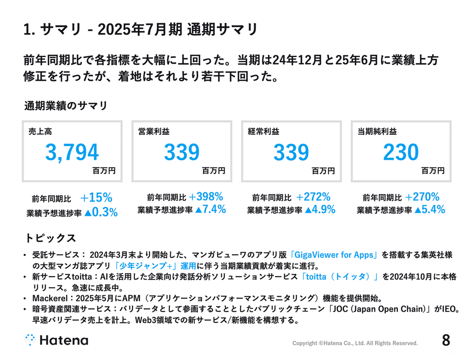 2025年9月12日、株式会社はてなが2025年7月期通期決算を発表しました。