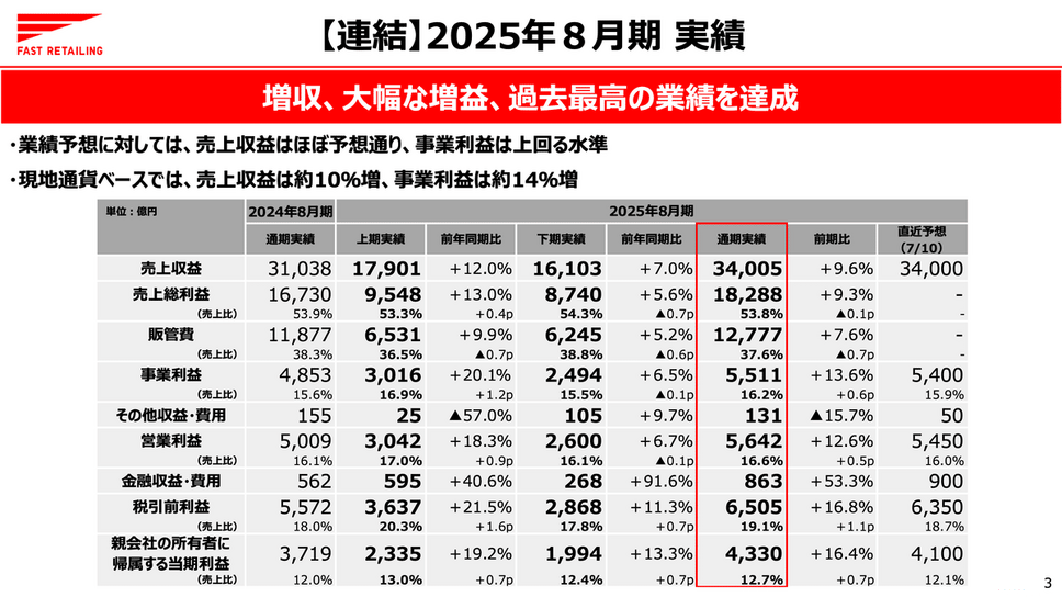 2025年10月9日、株式会社ファーストリテイリングが2025年8月期通期決算を発表しました。