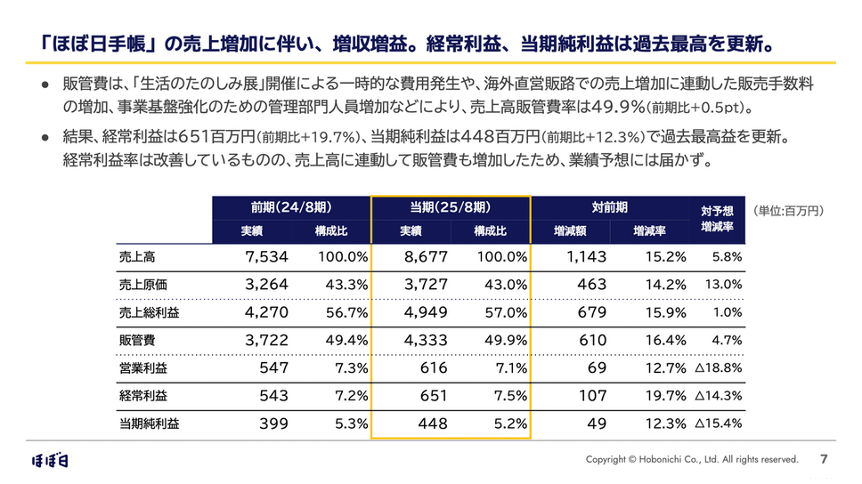 一方で、「生活のたのしみ展」に関連する一時的な費用発生や、管理部門の人員増加によって販管費が上昇したため、営業利益はYoY+12.7%の6.2億円にとどまりました。