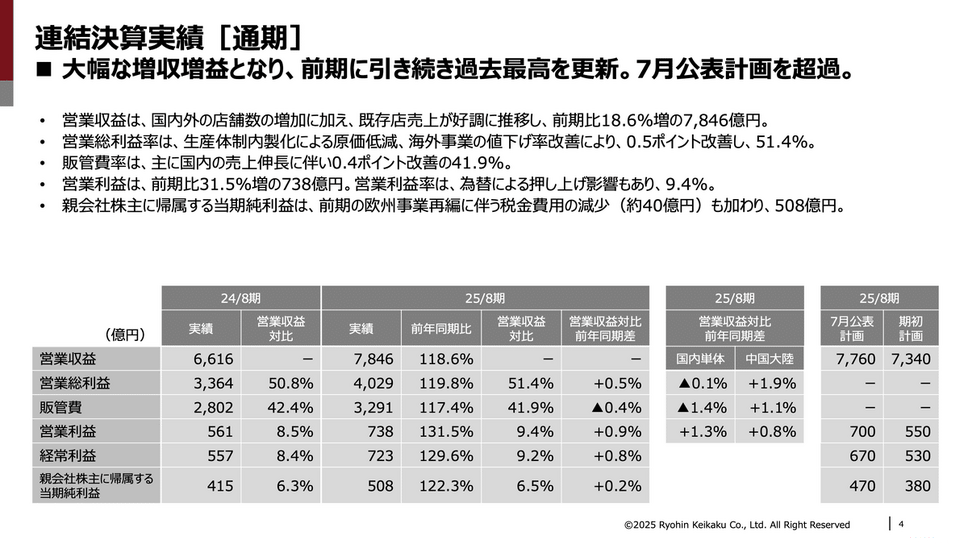 良品計画 2025年8月期通期決算(2024年9月~2025年8月)