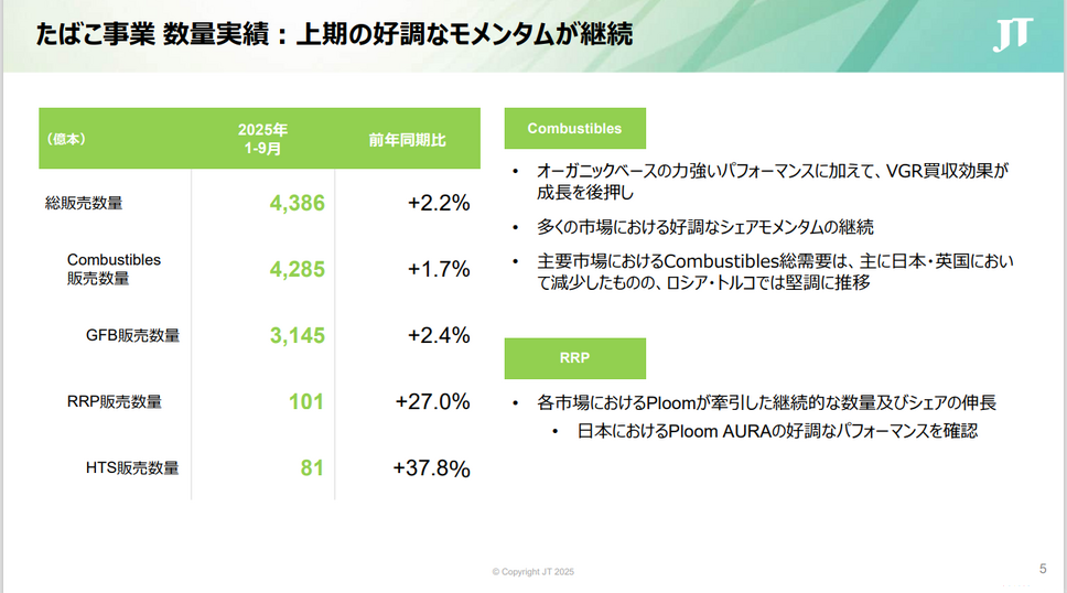 総販売数量は4,386億本(前年同期比+2.2%)、うち紙巻きたばこは4,285億本(+1.7%)と増加しました。