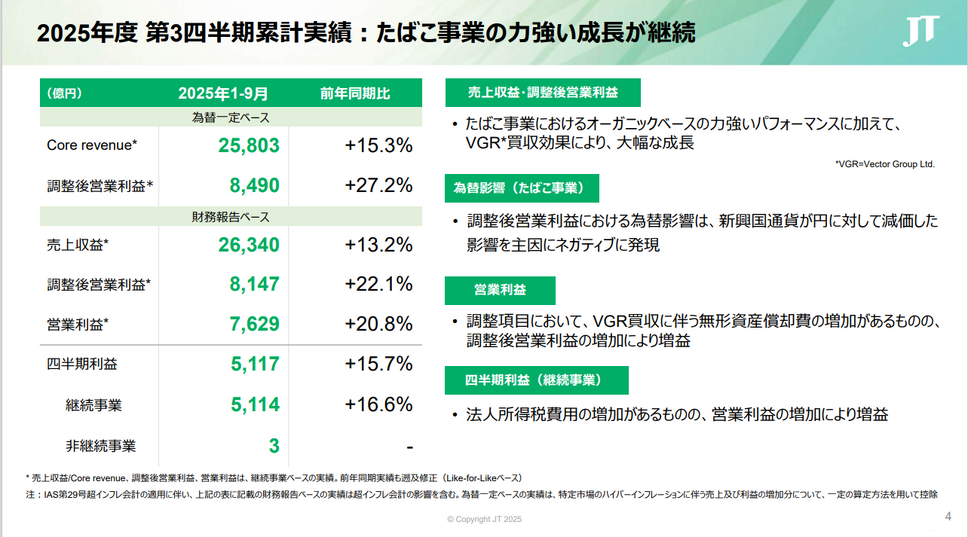 JTの2025年度第3四半期累計は、売上収益2兆6,340億円(前年同期比+13.2%)、調整後営業利益8,147億円(同+22.1%)、営業利益7,629億円(同+20.8%)、継続事業からの四半期利益5,114億円(同+16.6%)と、全ての指標で二桁成長を達成しました。