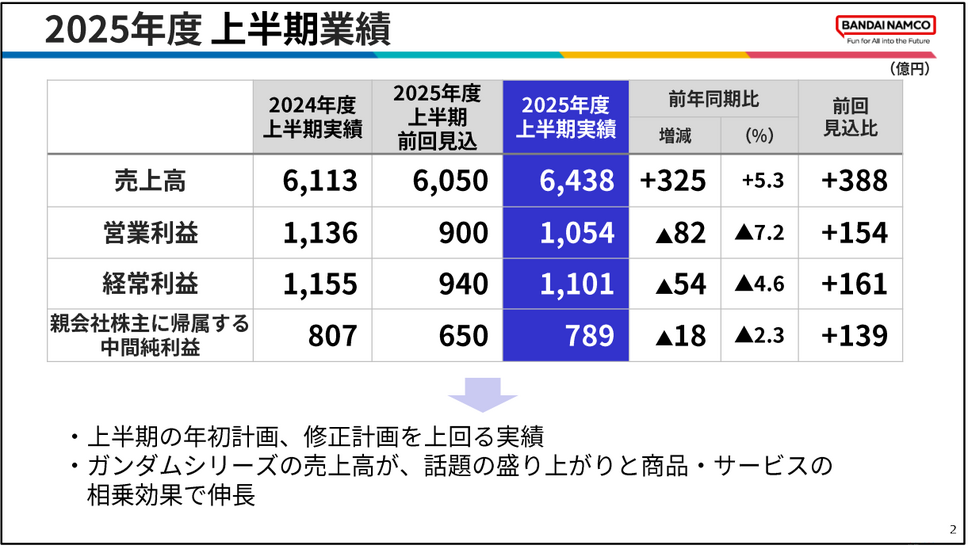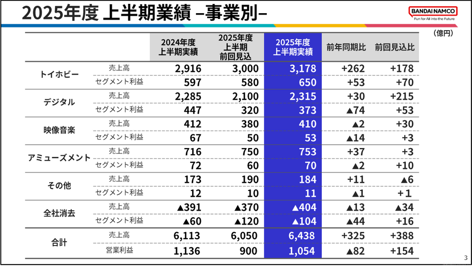 増収の要因は、トイホビー事業の好調な伸長とアミューズメント事業の安定推移にあります。一方で減益となったのは、デジタル事業におけるリピートタイトルの販売減少による利益率低下と、映像音楽事業で前年同期に複数の大型劇場作品がヒットした反動が影響しました。