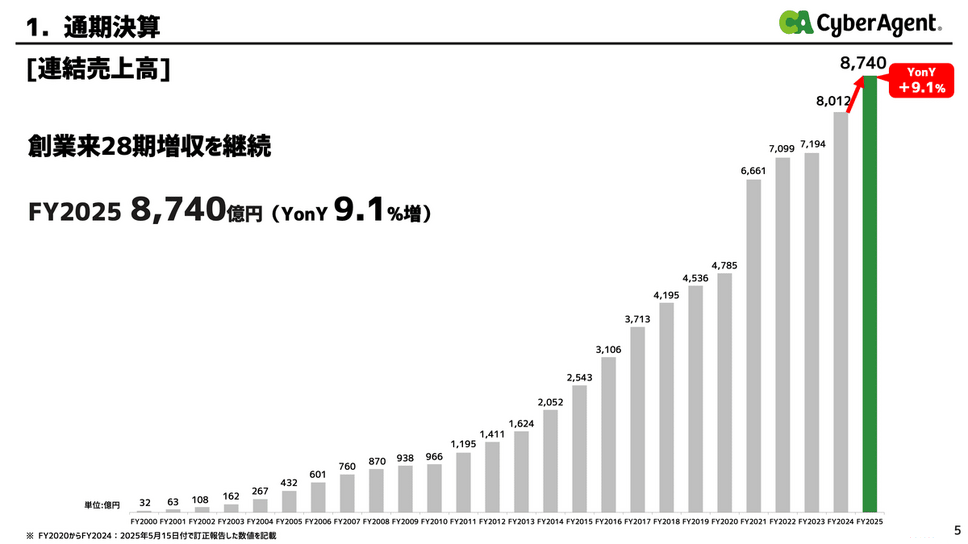 サイバーエージェントの2025年9月期通期決算(2024年10月~2025年9月)を見ると、まず売上高はYoY+9.1%の8,740億円となり、創業以来28期連続の増収を達成しました。