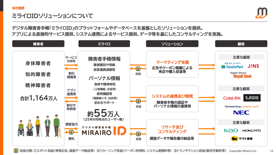 ミライロはデジタル障害者手帳「ミライロID」を基盤に、障害当事者のデータを活用したマーケティング支援やシステム連携開発、コンサルティングを提供する企業です。