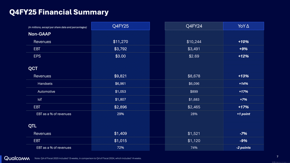 クアルコムの2025年9月期Q4決算(2025年7月~9月)を見ると、売上高はYoY+10%の$11.3B(約1.7兆円)、EBT(税引前利益)はYoY+9%の$3.8B(約5,700億円)で増収増益となりました。