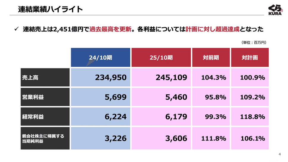 くら寿司の2025年10月期通期決算(2024年11月~2025年10月)を見ると、売上高はYoY+4.3%の2,451億円となり、過去最高を更新しました。