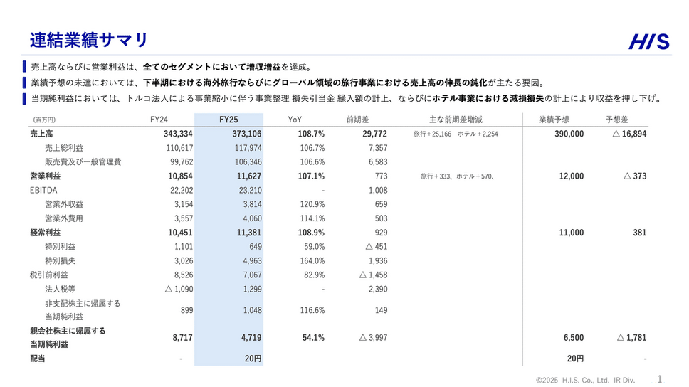 2025年12月12日、株式会社エイチ・アイ・エス(以下、HIS)が2025年10月期通期決算を発表しました。