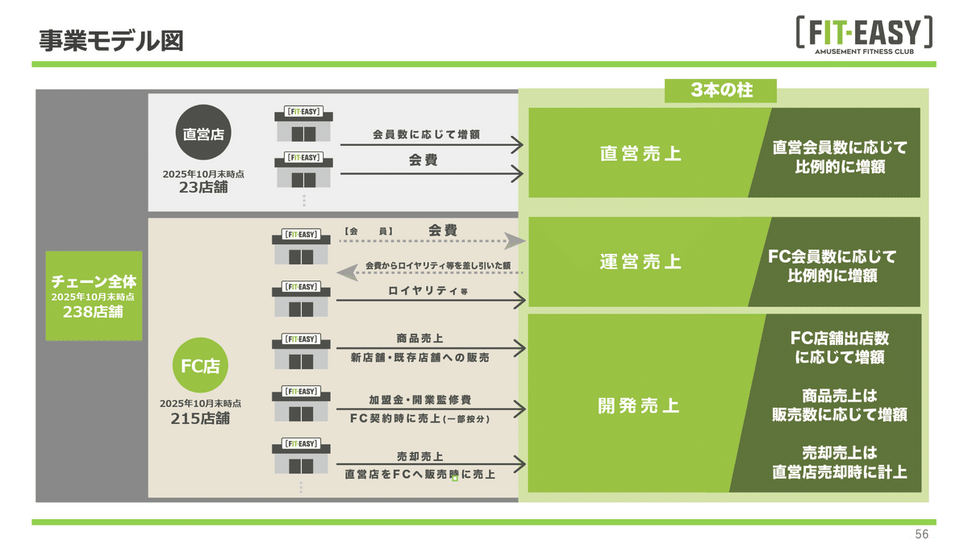 直営会員数に応じて伸びる直営売上、FC会員数や出店数に連動する運営売上と開発売上の3本柱で収益を構成しており、会員数と店舗数の拡大がそのまま成長につながるモデルとなっています。