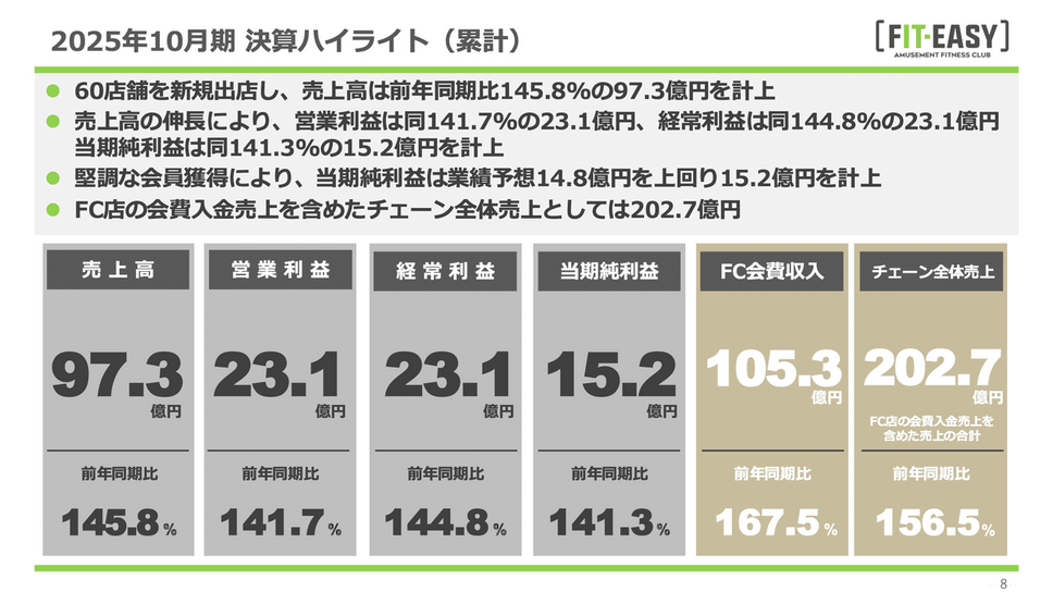 フィットイージーの2025年10月期通期決算(2024年11月~2025年10月)を見ると、売上高はYoY+45.8%の97.3億円となり、積極的な出店と会員獲得が高成長をけん引しました。