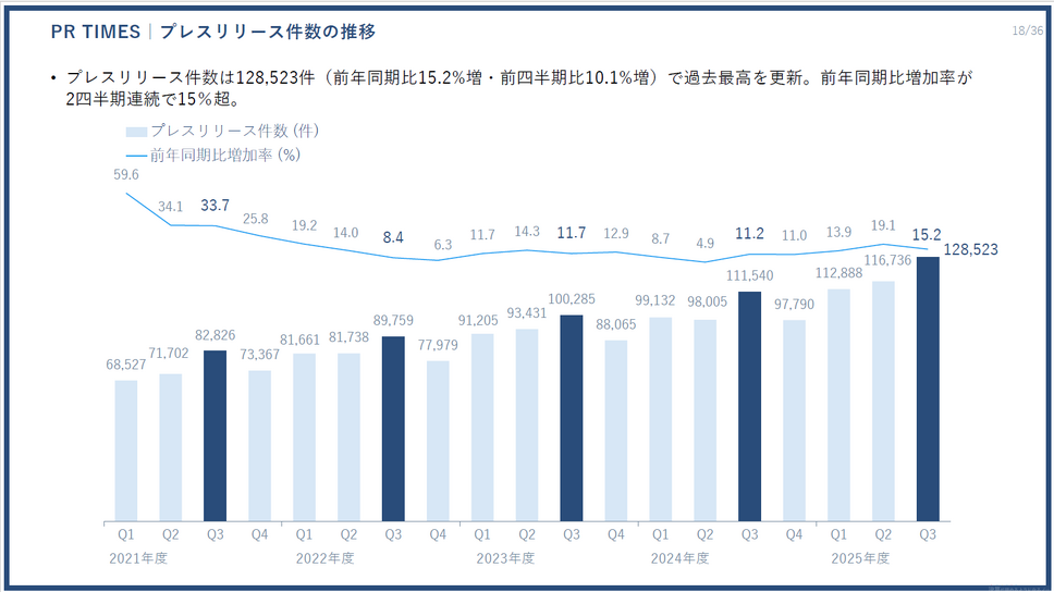 PR TIMESのプレスリリース配信件数は、第3四半期に128,523件を記録し、四半期として過去最高を更新しました。前年同期比では15.2%増、前四半期比でも10.1%増と、成長が加速しています。前年同期比増加率が2四半期連続で15%を超えており、利用が一層活発化していることがわかります。