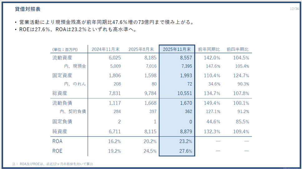 貸借対照表を見ると、現預金残高は73億95百万円で前年同期比47.6%増と大幅に増加しました。営業活動によるキャッシュ創出が順調に進んでいます。ROEは27.6%、ROAは23.2%といずれも高水準で、資本効率の面でも優れた経営が続いています。