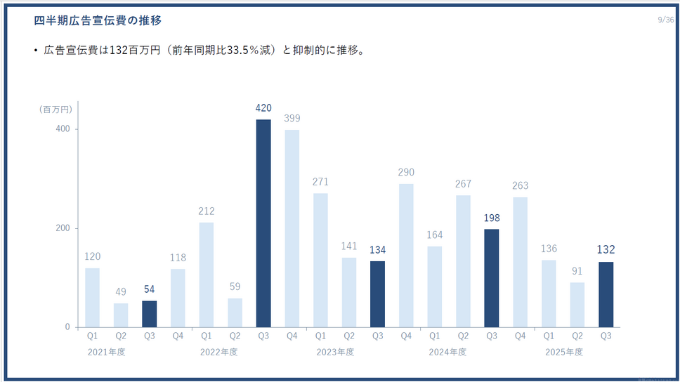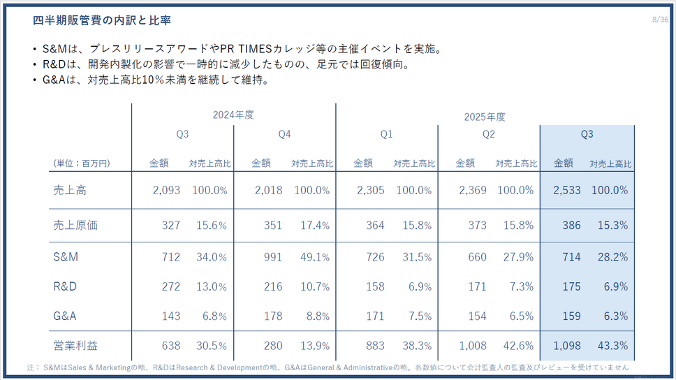 第3四半期の広告宣伝費は1億32百万円で、前年同期比33.5%減と抑制的に推移しました。広告宣伝費を抑えながらも売上高成長率20%超を達成していることは、PR TIMESのサービスが口コミや自然流入で広がっていることを示しています。