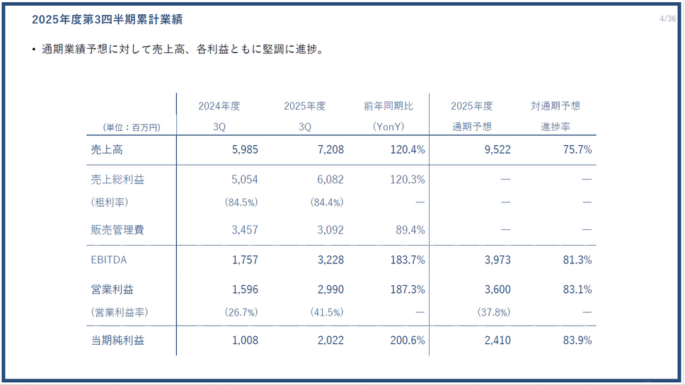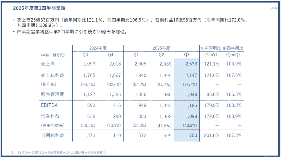 四半期営業利益は第2四半期に続いて10億円を超え、2四半期連続での大台達成となりました。売上総利益率も84.7%と高水準を維持しており、収益性の高いビジネスモデルが継続しています。