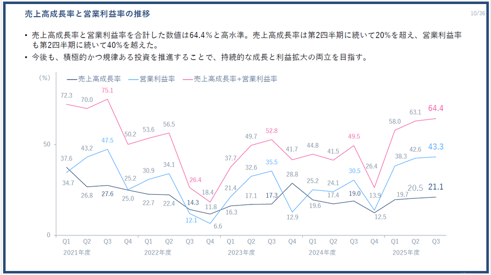 特筆すべきは、売上高成長率と営業利益率の両立です。第3四半期の売上高成長率は21.1%、営業利益率は43.3%となり、両指標ともに2四半期連続で高水準を達成しました。売上高成長率と営業利益率を合計した数値は64.4%に達しており、成長性と収益性を高いレベルで両立しています。