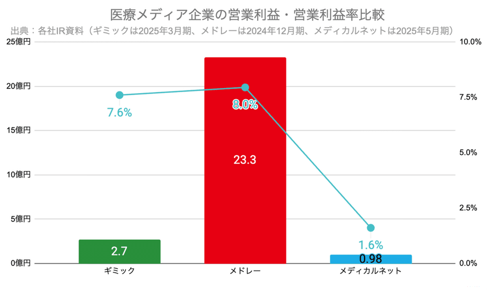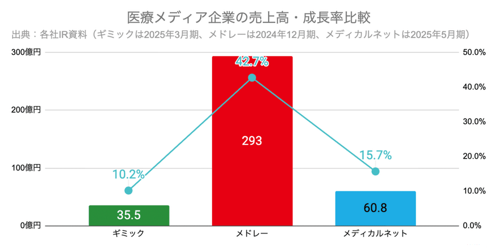 医療メディア企業の売上高を見ると、売上規模ではメドレーが293億円と圧倒的である一方、ギミックは売上高がYoY+10.2%の35.5億円と中規模ながら二桁成長を維持しています。