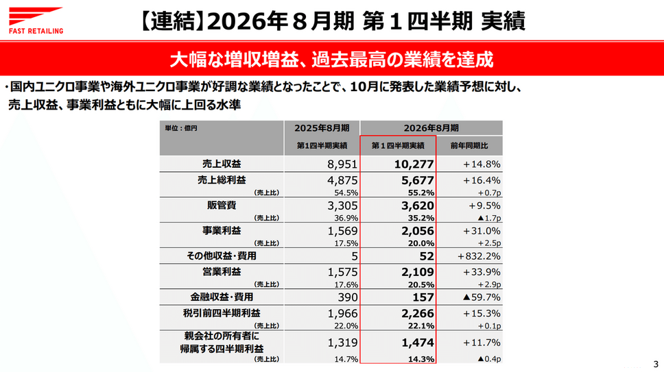 ファーストリテイリングのFY2026 1Q(2025年9月~11月)の売上収益は1兆277億円(YoY+14.8%)、営業利益は2,109億円(YoY+33.9%)となりました。