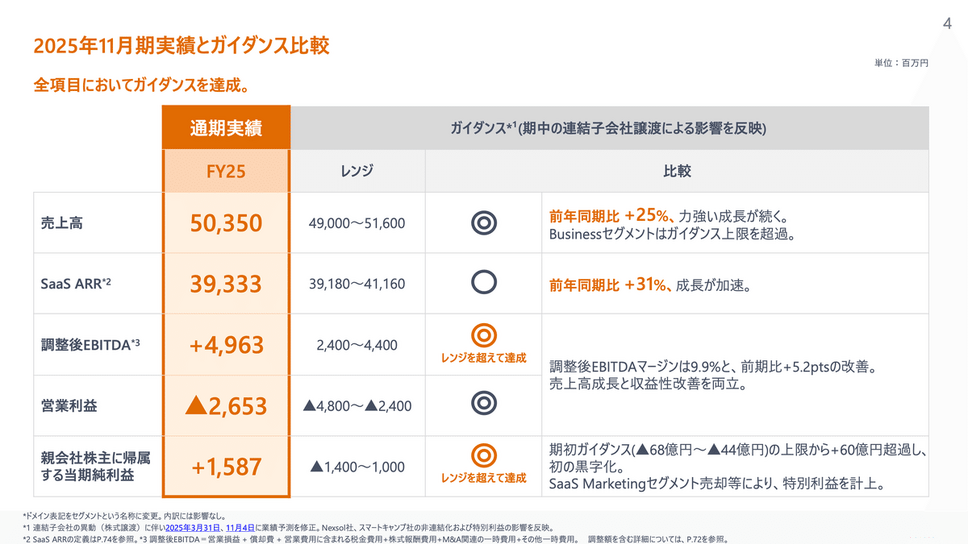マネーフォワードの2025年11月期通期決算を見ると、売上高はYoY+25%の503.5億円となり、ガイダンスレンジ内で着地しました。