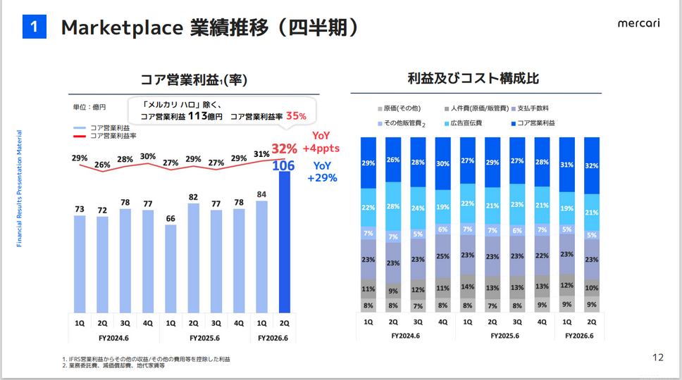 メルカリが発表した2026年6月期第2四半期決算は、市場の期待を大きく上回る内容でした。連結売上収益は568億円で前年同期比15%増、コア営業利益は109億円で同54%増となり、いずれも四半期として過去最高を記録しています。