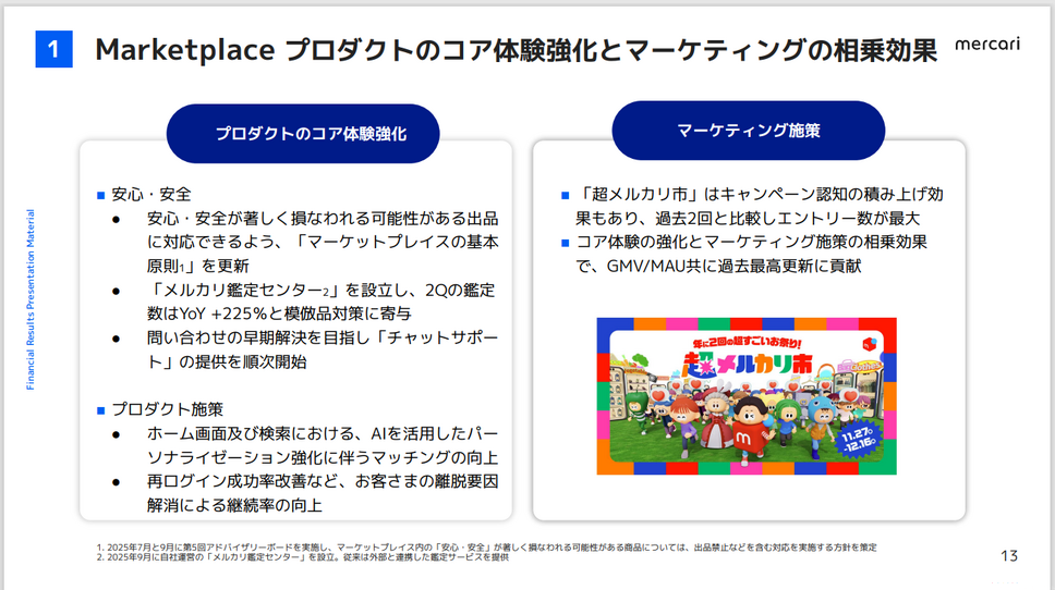 加えて、11月末から12月中旬にかけて実施した「超メルカリ市」キャンペーンも大きく貢献しました。配送料の値引きや出品者・購入者向けのポイント還元施策を展開したこのキャンペーンは、過去2回と比較してエントリー数が最大となりました。プロダクト改善によって高まった顧客満足度と、適切なタイミングでのマーケティング施策が相乗効果を生み出した好例といえます。