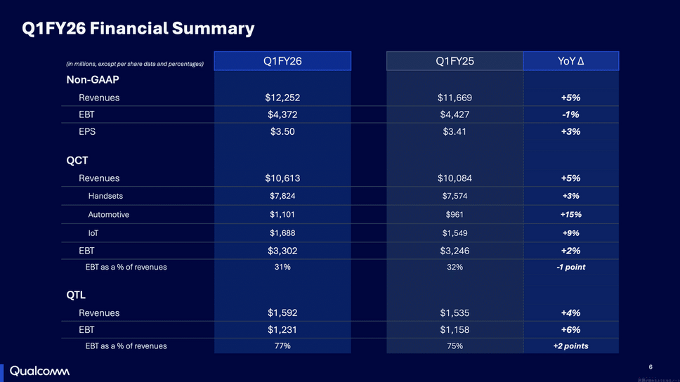 Qualcommの2026年9月期Q1決算(2025年10月~2025年12月)を見ると、売上高はYoY+5%の$12.3B(約1.8兆円)となりました。