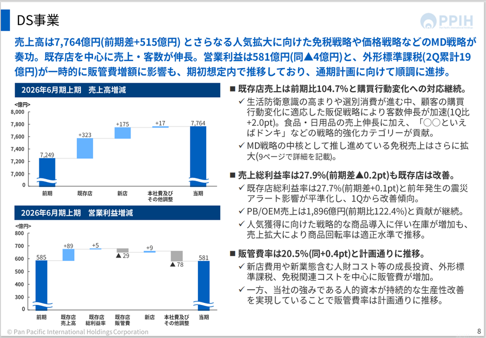 PPIHの2026年6月期第2四半期累計の連結業績は、売上高1兆2,101億円(前期比+815億円/+7.2%)、営業利益940億円(前期比+42億円/+4.7%)となり、中間期・2Q単体ともに過去最高の売上高・営業利益を達成しました。上期計画も上回っています。