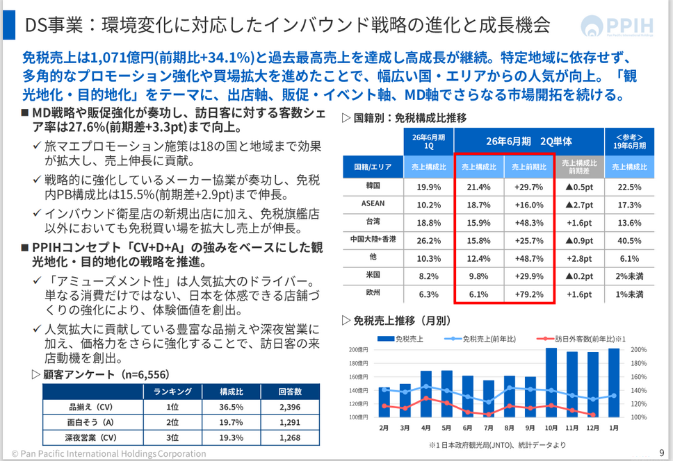 免税売上は1,071億円(前期比+34.1%)と過去最高売上を達成し高成長が継続。特定地域に依存せず、多角的なプロモーション強化や買場拡大を進めたことで、幅広い国・エリアからの人気が向上しました。