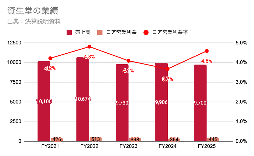 直近では、資生堂の売上高はFY2022をピークに横ばい・微減が続いており、コア営業利益率も低下していました。