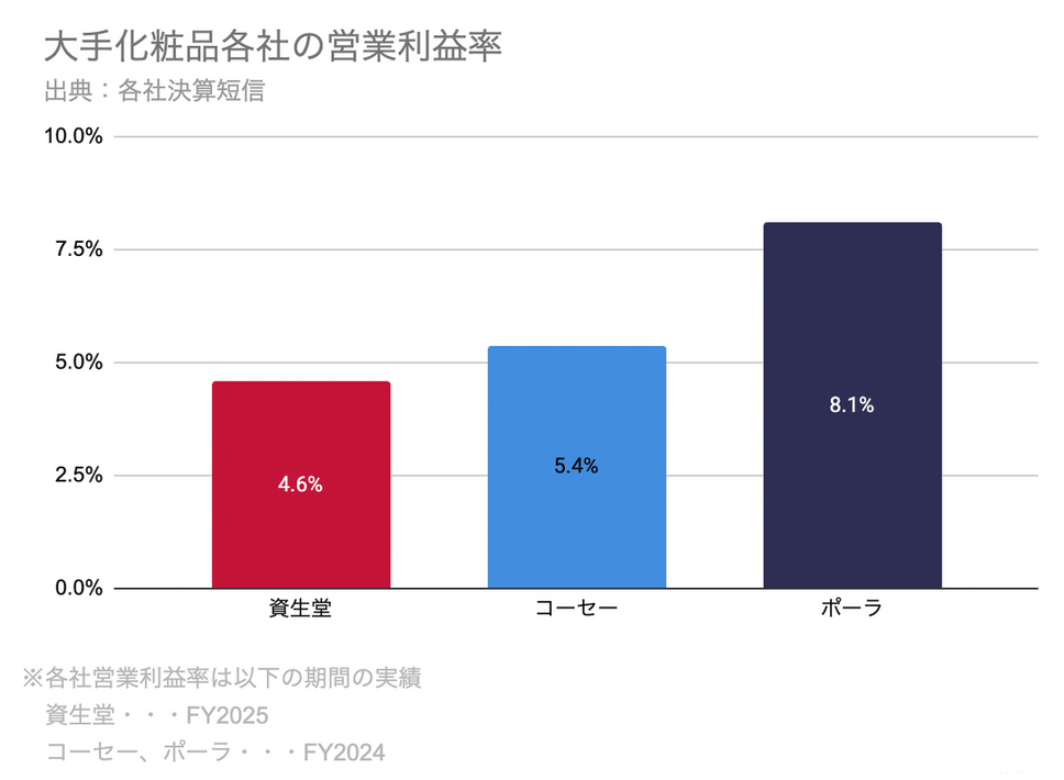 業界大手3社を比較すると、現在最も高いポーラでも営業利益率8.1%、次いでコーセーの5.4%となっており、資生堂の掲げる営業利益率10%は非常に難易度の高い挑戦であることがわかります。