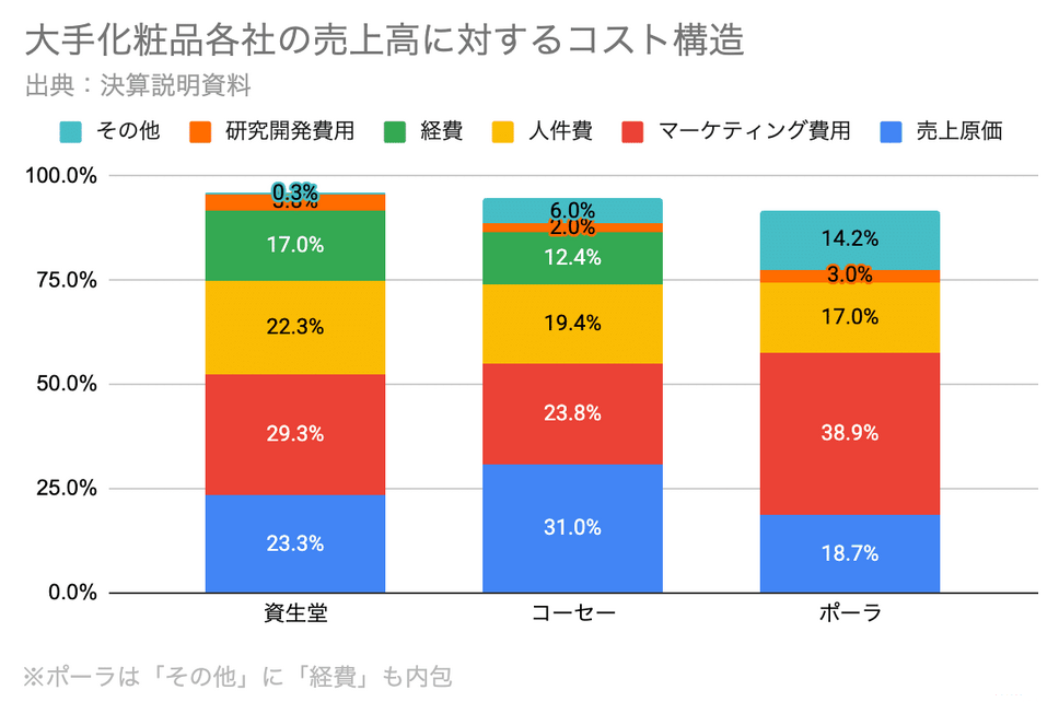 まず人件費について、資生堂の人件費率22.3%は、コーセー19.4%、ポーラ17.4%と比べて、2.9pt~4.9ptもの差があります。