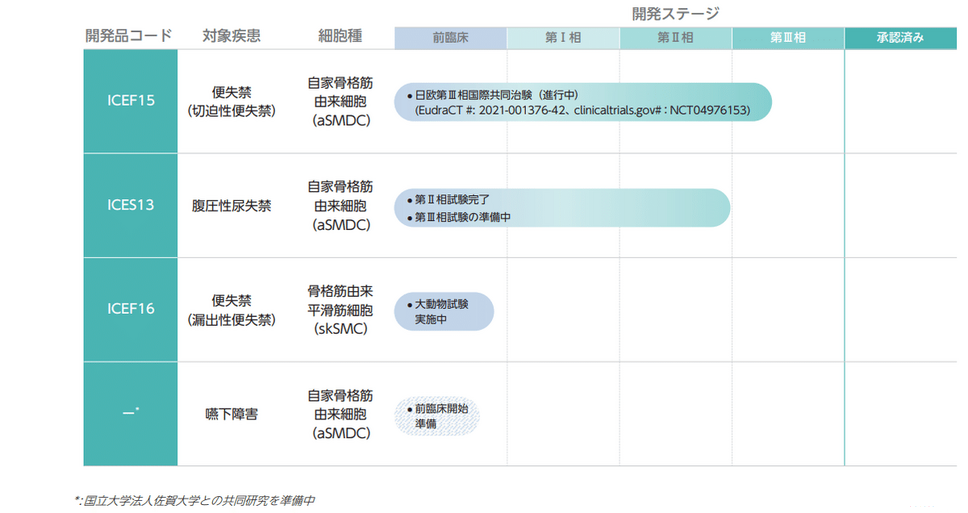 主力パイプラインは、患者自身の骨格筋由来細胞を用いる再生医療です。開発コード「ICES13」は腹圧性尿失禁を対象としており、第Ⅰ相試験を終了し、現在は第Ⅲ相試験に向けた準備段階にあります。