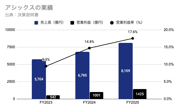 アシックスの営業利益率を見ると、FY2023:9.5%→FY2025:17.6%と、3年で1.8倍に大きく伸長しています。
