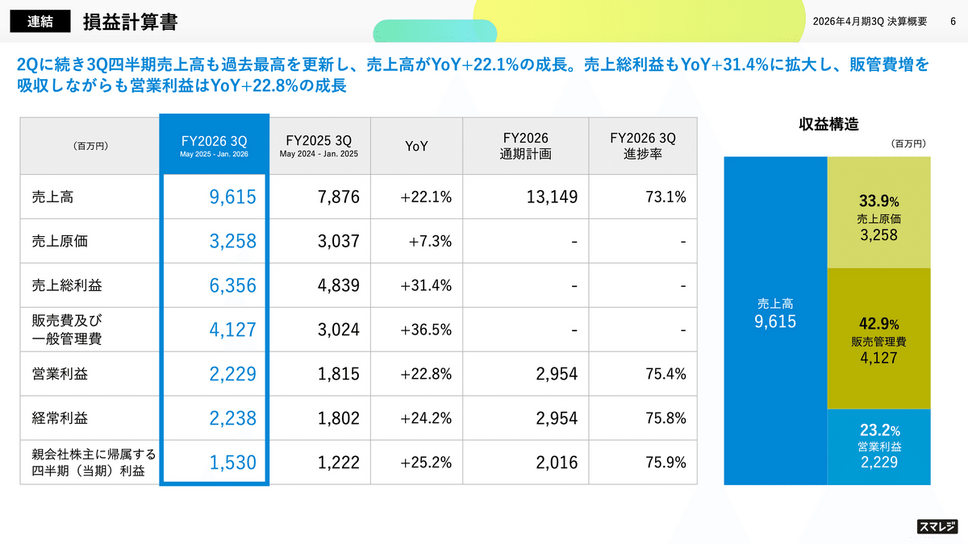 2026年3月13日、株式会社スマレジが2026年4月期第3四半期決算を発表しました。