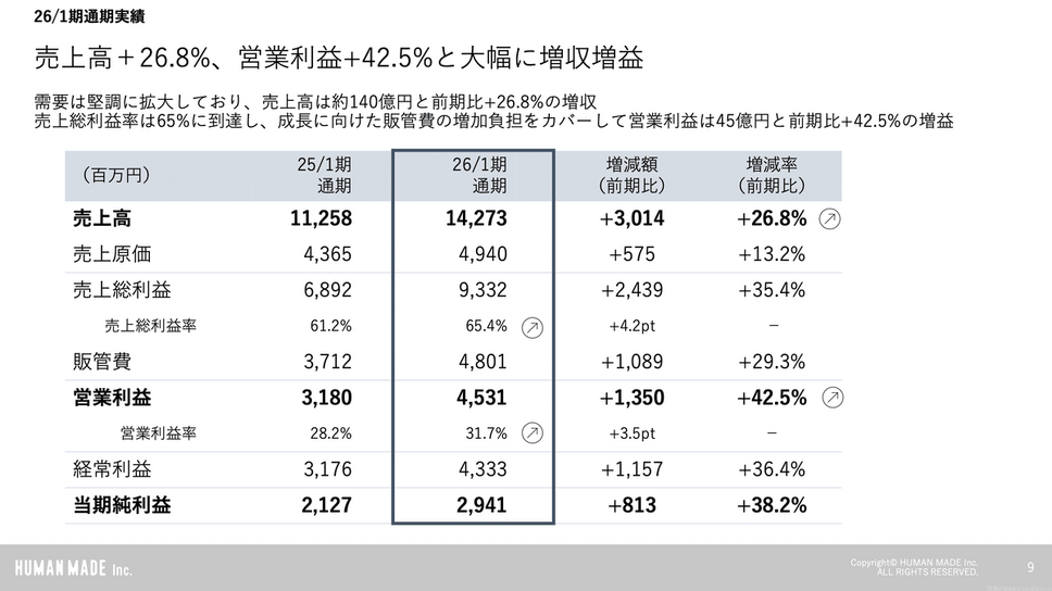 HUMAN MADEの2026年1月期通期決算を見ると、売上高はYoY+26.8%の142.7億円、営業利益はYoY+42.5%の45.3億円と大幅な増収増益となりました。