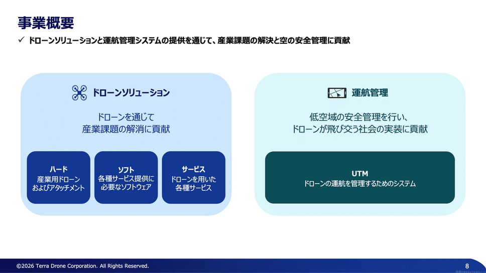 事業は大きく「ドローンソリューション」と「運航管理」に分かれており、測量・点検・農業といった現場サービスに加えて、ドローンの運航インフラとして「UTM」を展開しています。