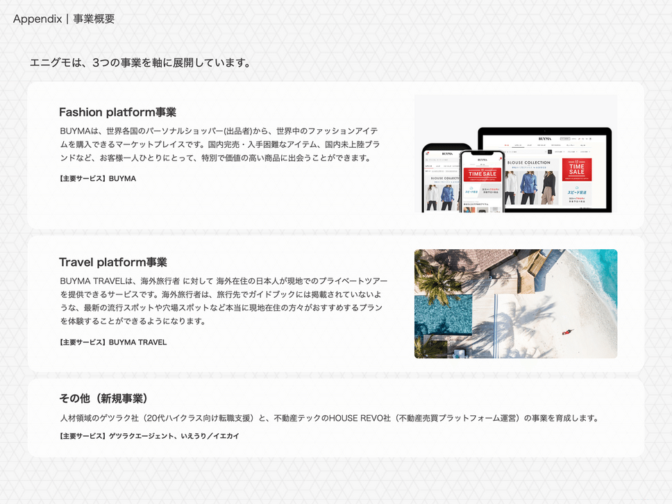 エニグモは、ファッション領域のマーケットプレイス「BUYMA」を中核とし、旅行体験を提供する「BUYMA TRAVEL」、さらに人材や不動産などの新規事業を展開する企業です。
