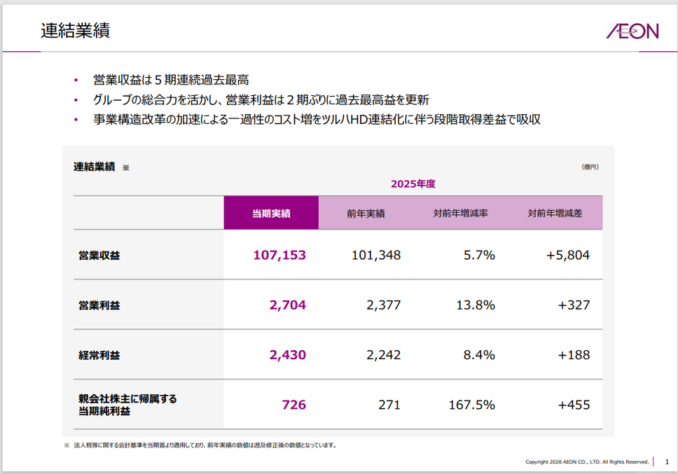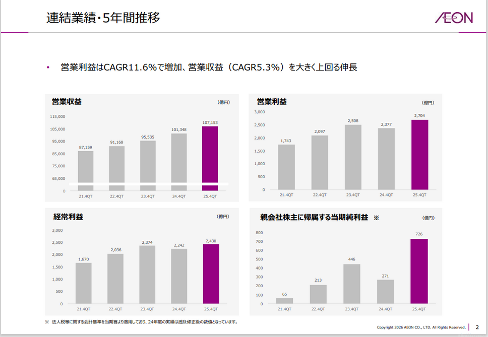 2026年2月期の連結業績は、営業収益10兆7,153億円(前年比+5.7%)、営業利益2,704億円(同+13.8%)、経常利益2,430億円(同+8.4%)、親会社株主に帰属する当期純利益726億円(同+167.5%)となりました。