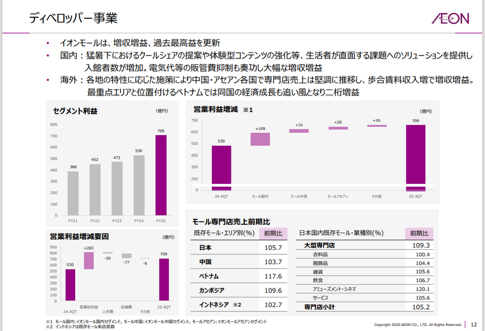 国内では、猛暑下におけるクールシェアの提案や体験型コンテンツの強化等、生活者が直面する課題へのソリューションを提供し入館者数が増加。電気代等の販管費抑制も奏功し大幅な増収増益となりました。海外では、各地の特性に応じた施策により中国・アセアン各国で専門店売上は堅調に推移し、歩合賃料収入増で増収増益。最重点エリアと位置付けるベトナムでは同国の経済成長も追い風となり二桁増益を達成しています。