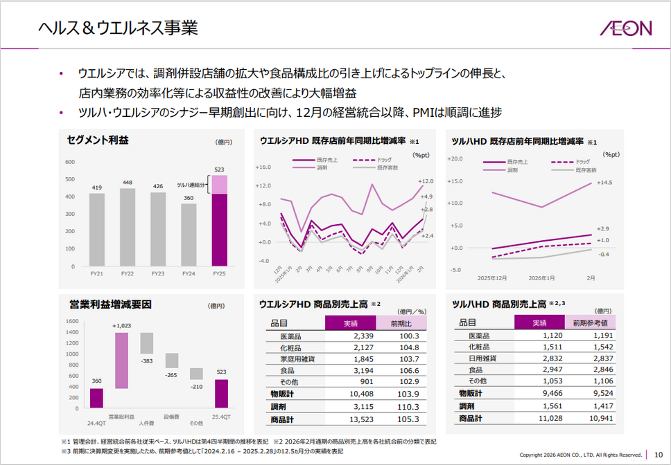 ウエルシアでは、調剤併設店舗の拡大や食品構成比の引き上げによるトップラインの伸長と、店内業務の効率化等による収益性の改善により大幅増益となりました。ツルハ・ウエルシアのシナジー早期創出に向け、経営統合以降、PMIは順調に進捗しています。