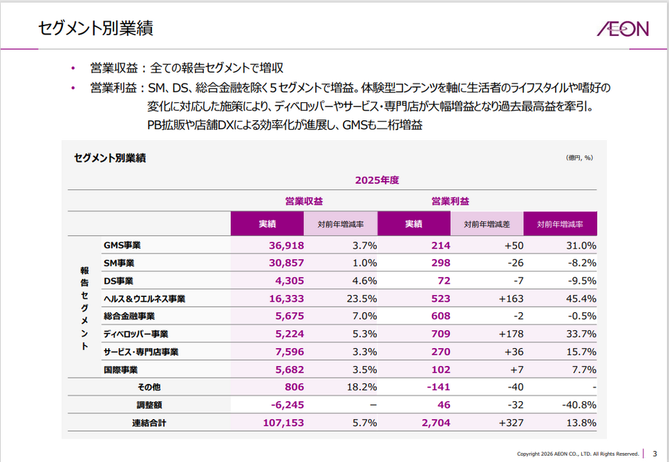 GMS事業は復調しています。営業収益3兆6,918億円(前年比+3.7%)、営業利益214億円(同+31.0%)と二桁増益を達成しました。