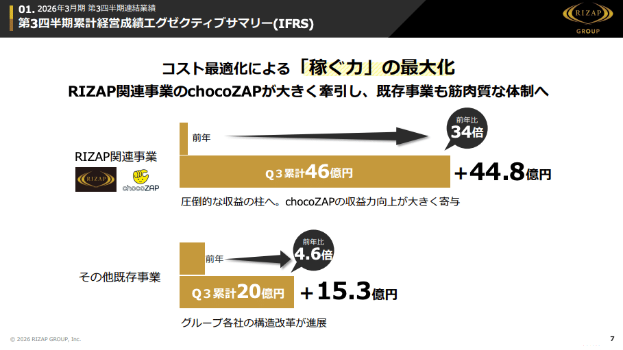 このようにRIZAPの営業利益が前年同期比+72億円(約15倍)に伸長している主因は、chocoZAPの急拡大と既存事業の収益改善が同時に進んだことにあります。